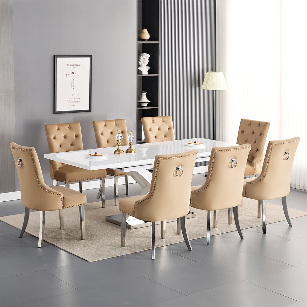 Axton Large Extending White Dining Table 8 Irvine Champagne Chairs